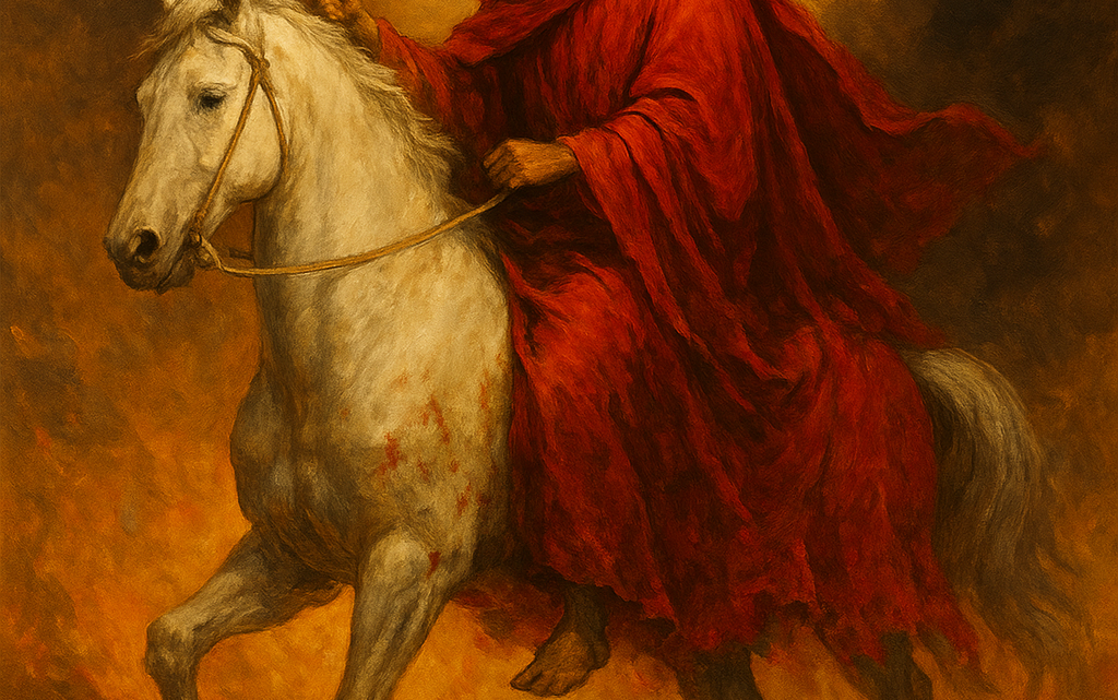 Riding a white horse, eyes blazing with justice, His robe dipped in blood,